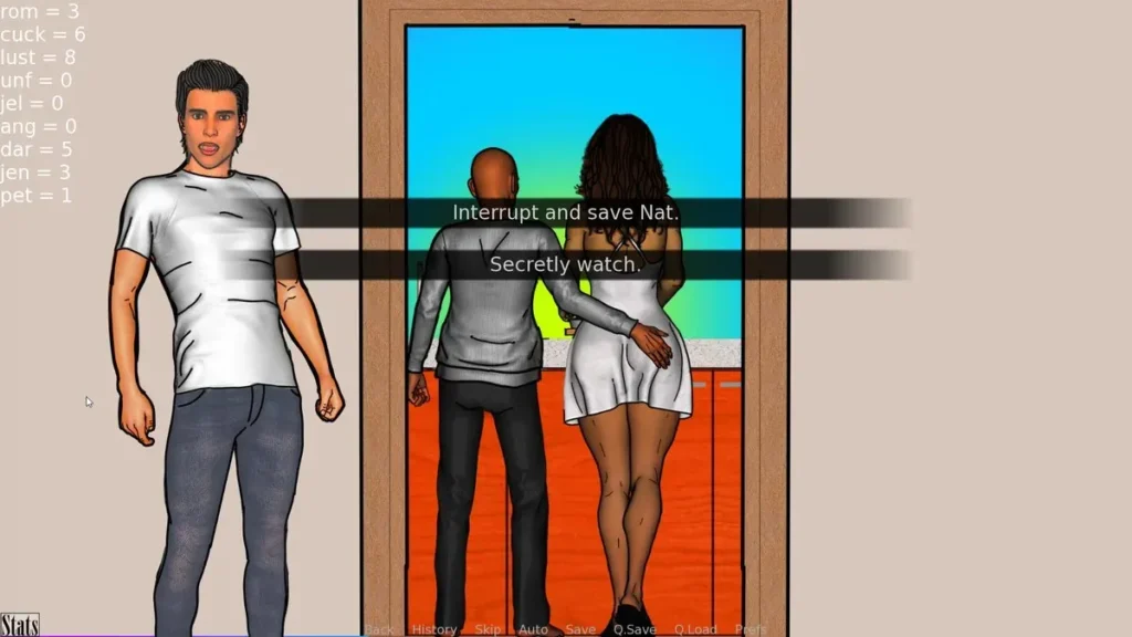 I chose option one, boosting LUST and a tiny bit of CUCK. This single decision opened a branch hours later where Nat, more confident and physically aware, suggests a risqué game during a date night—a scene I never saw when I replayed and chose the jealous option! That’s the power of game branching paths. There’s no “right” answer, only consequences that feel earned and authentic.